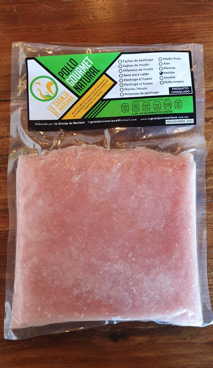 Bolsa de molida de pollo es de aproximadamente 500 gramos, empacada al vacío y congelada para preservar la inocuidad del alimento. ¡Ideal para preparar tortitas de pollo o albóndigas!